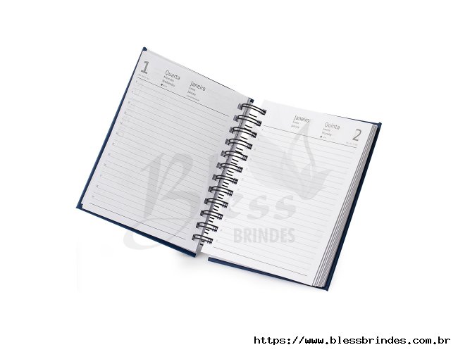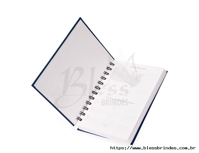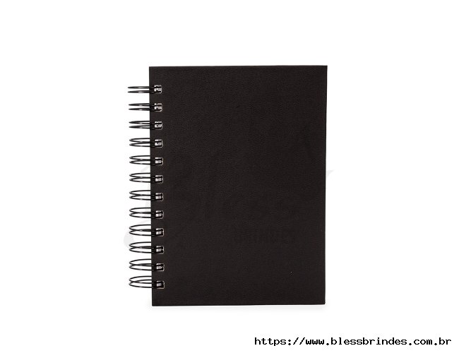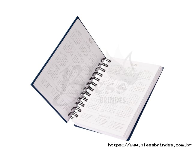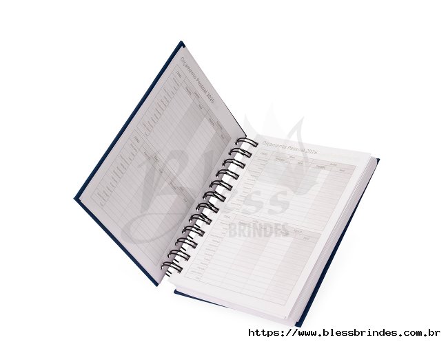 Agenda 2026 com capa em cromato e encadernação em Wire-O metálico. Conta com páginas dedicadas para dados pessoais, calendários de 2025 a 2027, orçamento pessoal, planejamento mensal, espaço para anotações diárias e lista de contatos e aniversários.