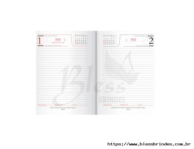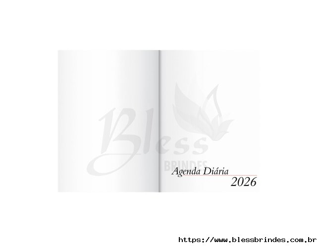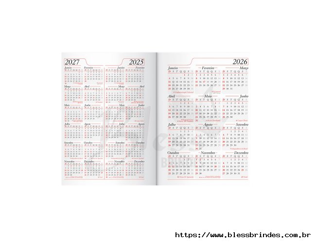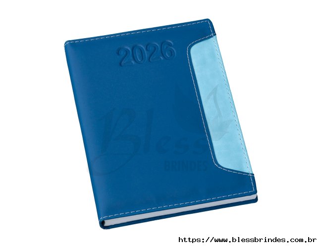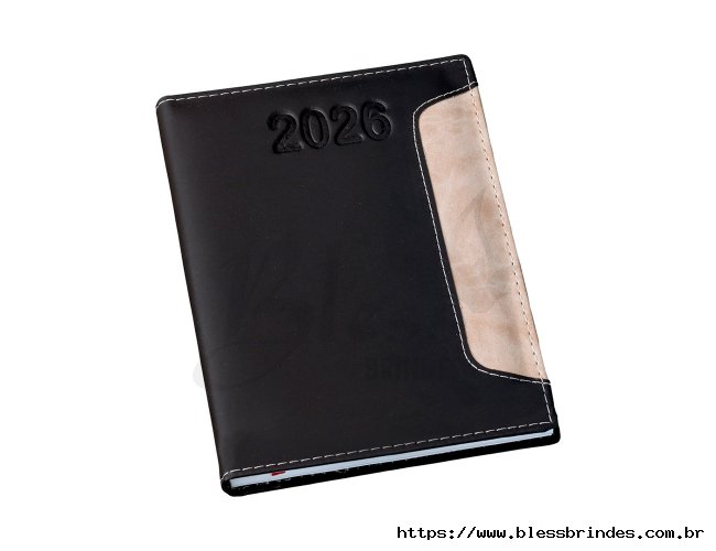 Agenda diária 2026 com capa em couro sintético e marca-páginas em fita de cetim. Contém páginas dedicadas para dados pessoais, calendários de 2025 a 2027, lista de contatos, planejamento e mapas.
