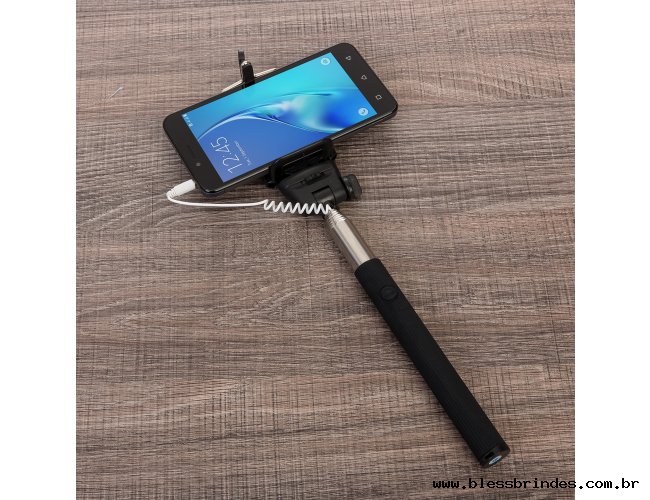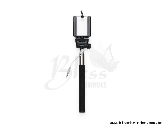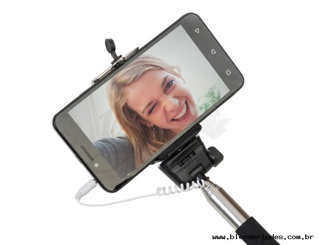 Bastão de selfie alumínio com detalhe emborrachado preto. Para utilizar basta conectar o cabo P2 no aparelho celular/tablet e apertar o botão no próprio bastão para bater a foto. Possui suporte plástico regulável, válvula lateral do bastão para ajuste de posicionamento e válula central para apertar o suporte. Suporte ajusta até 8,4cm de largura para encaixar celular, bastão estende até 81,8 cm de comprimento.