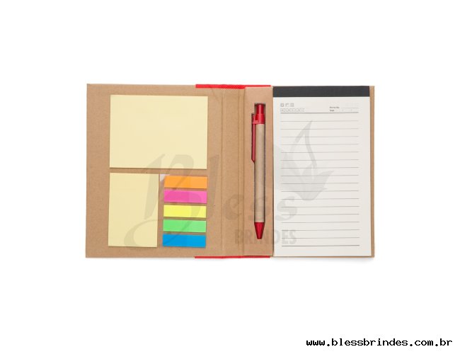 Descrição: Bloco de anotações ecológico com caneta e autoadesivos, material kraft. Possui uma faixa colorida em tnt e fita elástica, parte interna com suporte para caneta de papelão com clip plástico; bloco amarelo médio com aproximadamente 20 folhas; bloco amarelo pequeno com aproximadamente 20 folhas; cinco blocos autoadesivos coloridos com aproximadamente 20 folhas cada e bloco de folhas pardas com aproximadamente 70 folhas.