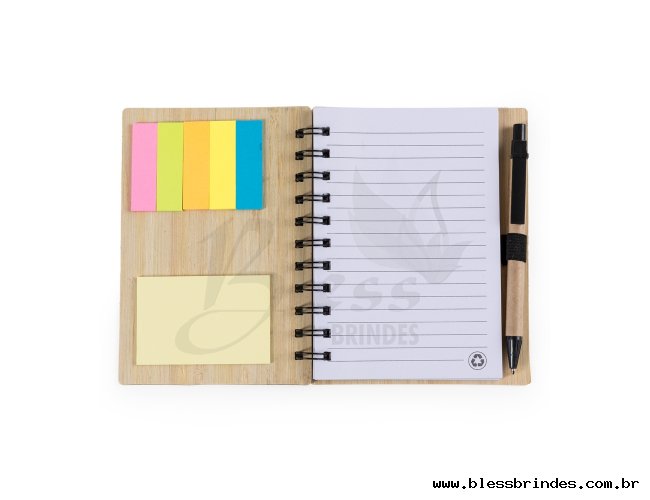 Bloco de anotações ecológico com caneta e post-it. Capa de bambu com cinco detalhes circulares vazados referente aos post-it internos, possui uma faixa preta no lado esquerdo da capa e verso liso. Cinco blocos auto-colantes coloridos com aproximadamente 20 folhas cada, bloco amarelo com aproximadamente 20 folhas e 70 folhas aproximadamente brancas pautadas com logo reciclado na lateral inferior. Acompanha suporte elástico de nylon com uma caneta de papelão com acessórios plásticos.