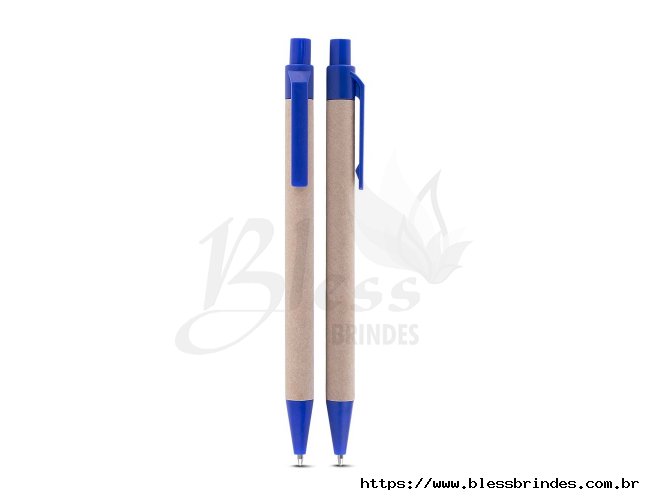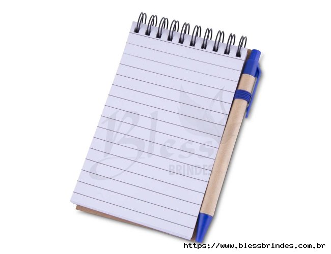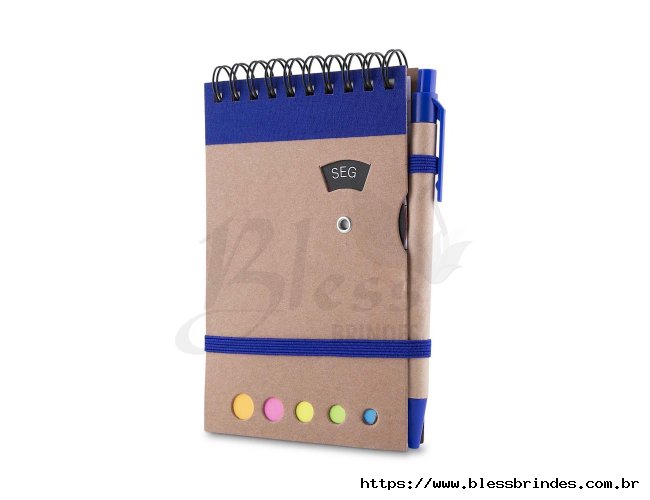 Bloco de anotações com capa em kraft, encadernação Wire-O, porta-caneta e fechamento em elástico, além de disco rotativo com os dias da semana. Inclui cerca de 70 folhas pautadas e cinco blocos de marcadores coloridos autocolantes, com 26 unidades cada. Acompanha caneta esferográfica azul de 1,0 mm, com corpo em papelão, acionamento por clique e detalhes em plástico.