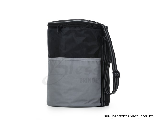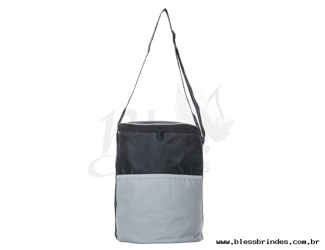 Bolsa térmica 25 litros preta com detalhes em cinza. Modelo poliester, possui dois zíperes com abertura em U, alça de ombro ajustável em nylon e bolso cinza frontal.