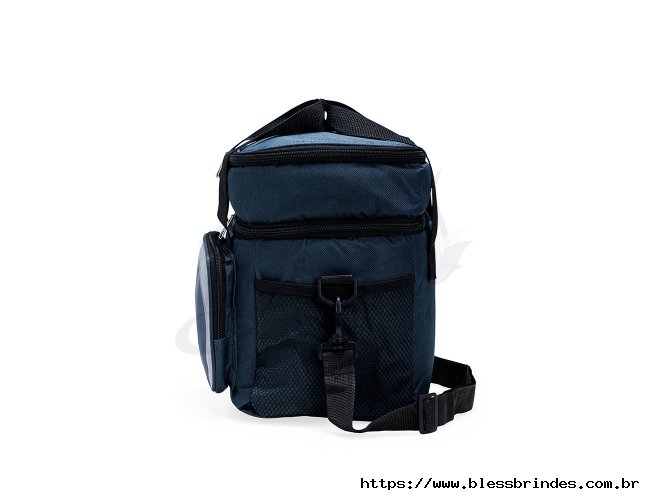 Bolsa térmica em Oxford 600D resistente à água e estrutura interna em espuma. Possui dois compartimentos térmicos com capacidade total de até 12 litros, sendo o superior com revestimento em alumínio e bolso interno em tela com elástico, enquanto o inferior apresenta revestimento em PEVA antivazamento. Conta também com bolso frontal com fechamento em zíper, dois bolsos em tela de nylon com elástico e duas alças de mão costuradas. Acompanha alça transversal ajustável.