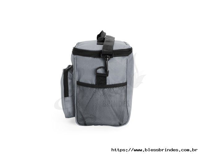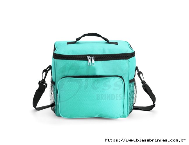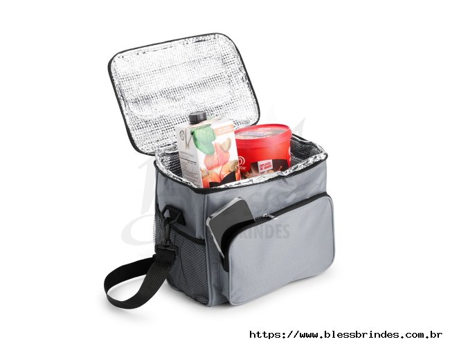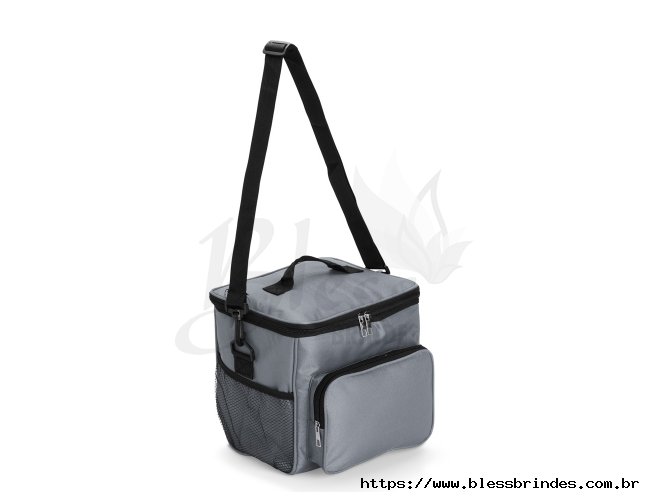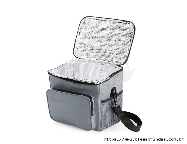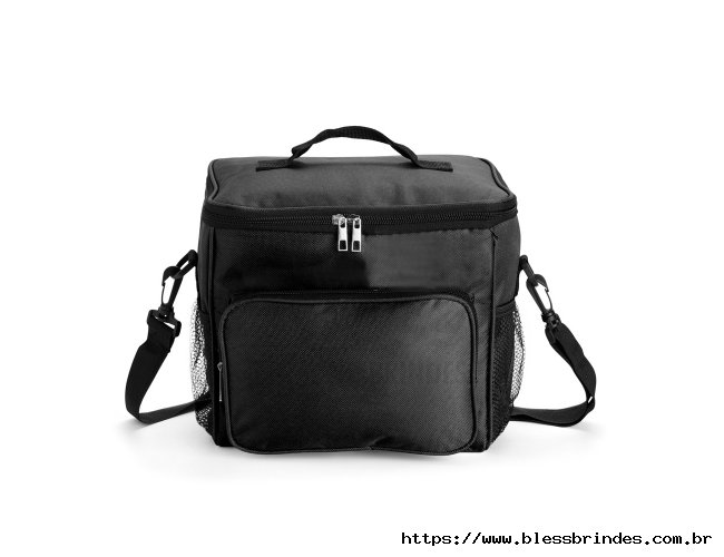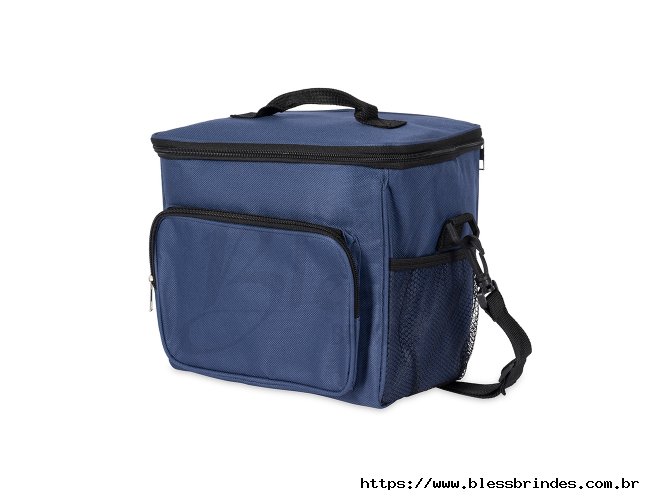 Bolsa térmica em Oxford resistente à água e com capacidade de até 11 litros. Seu revestimento interno em alumínio permite a conservação de temperatura de alimentos e bebidas por mais tempo. Possui também um bolso frontal e mais um par de bolsos laterais em tela de nylon, além de uma alça fixa na tampa e outra transversal.