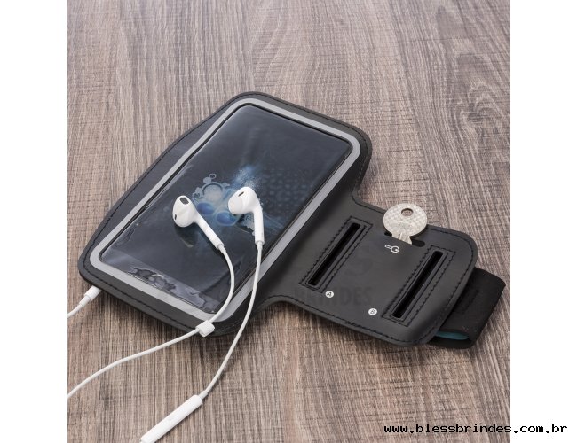Descrição: Braçadeira de neoprene com detalhe frontal em couro sintético. Visor plástico e contorno prata, possui "bolso" para chave, "cinta" de velcro regulável com posição indicativa na lateral(A e B). Possui contorno azulado no velcro, parte traseira possui 4 áreas vazadas para poder passar o fone de ouvido(também possuem contorno azulado).