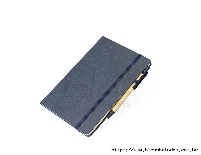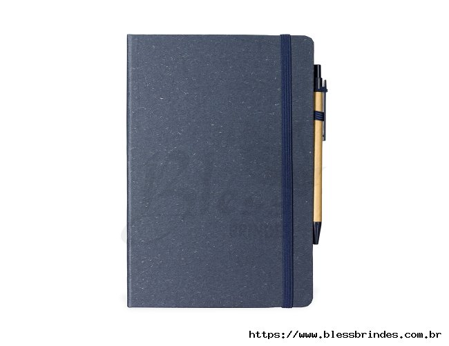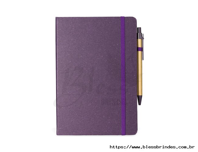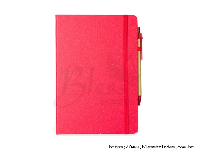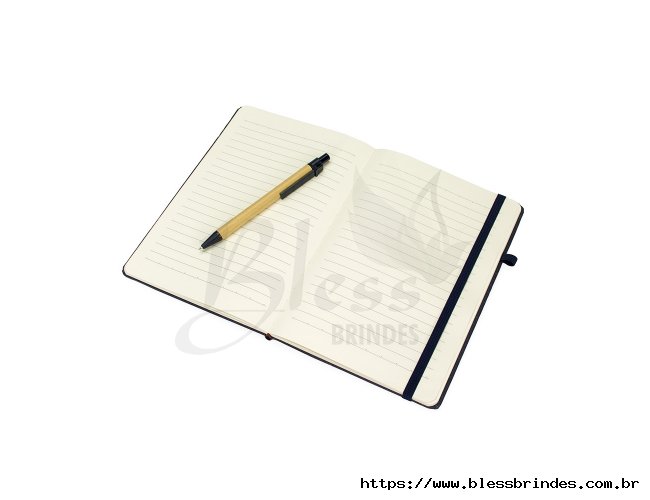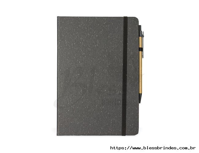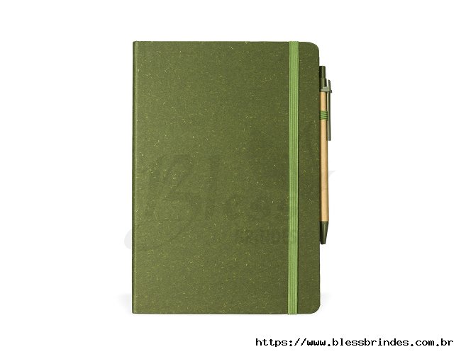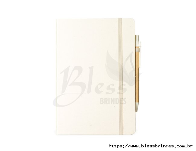 Caderneta ecológica com capa em fibra da palha de arroz. Contém aproximadamente 80 folhas amareladas com pauta, além de duas folhas de guarda, uma fita elástica para fechamento e porta-canetas em elástico. Acompanha uma caneta esferográfica de carga azul de 1,0mm com corpo em papelão e clip, acionamento por clique e ponteira em plástico.