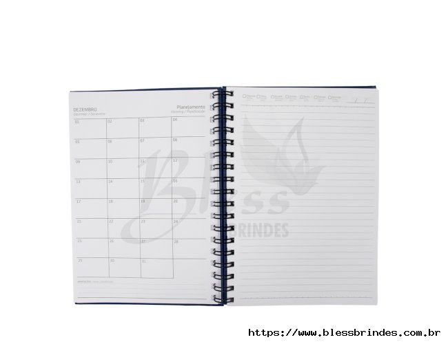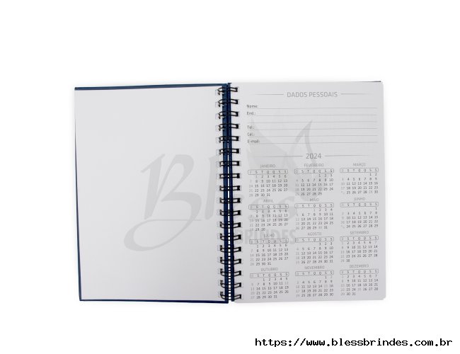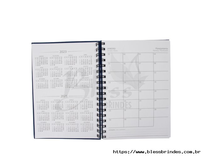 Caderno com capa em cromato e wire-o metálico. Possui aproximadamente 86 folhas pautadas e páginas para: dados pessoais, calendários de 2023 à 2025, planejamentos e endereços de contatos.