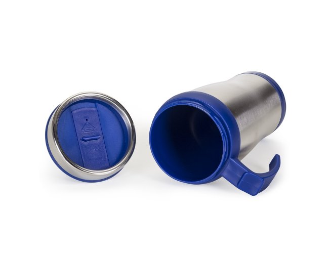 Caneca inox 400 ml com pegador e parte inferior plástica colorida. Tampa rosqueável, possui compartimento que pode ser aberto para beber(não é térmica).