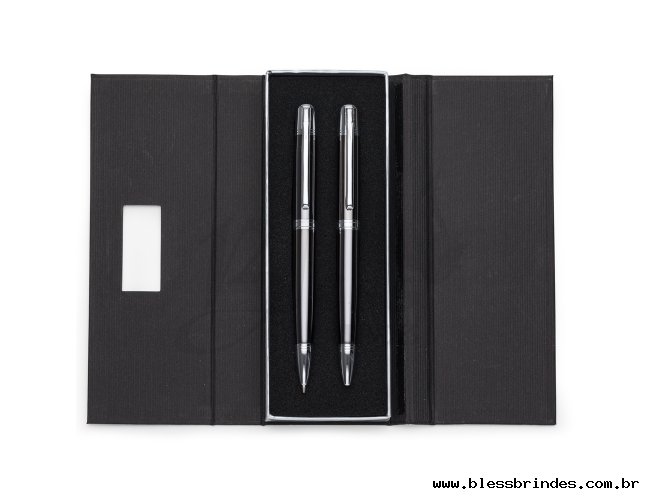 Descrição: Conjunto caneta e lapiseira em estojo de cartonagem com placa central para personalização. Clip metal com dois anéis em relevo, anel centralizado e dois anéis em relevo na ponteira e acionam por giro. Estojo revestida com espuma na parte interna.