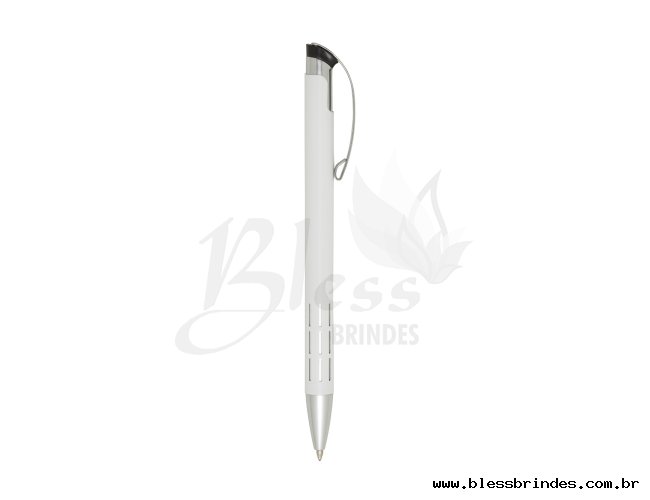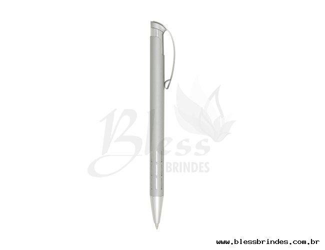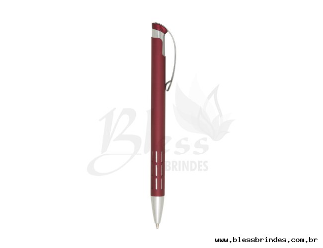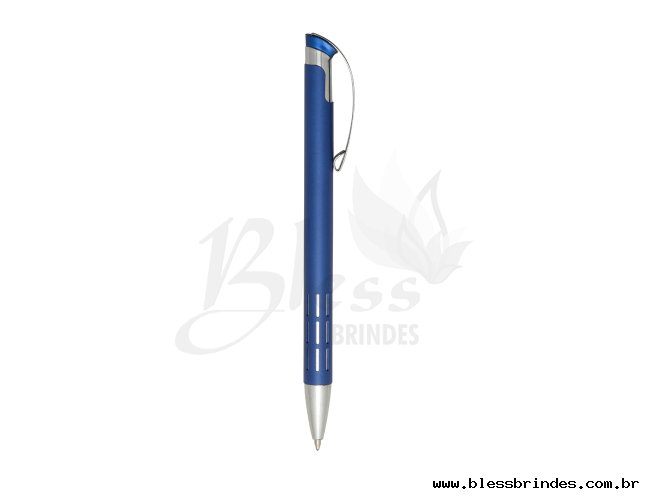 Caneta de metal inteira colorida com detalhes prata. Clip de metal com detalhe vazado na parte superior, possui vinte e quatro traços vazados na parte inferior. Aciona por clique.