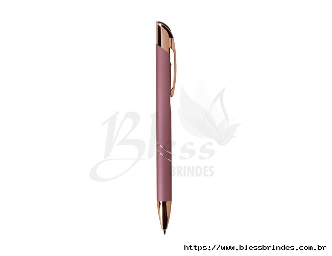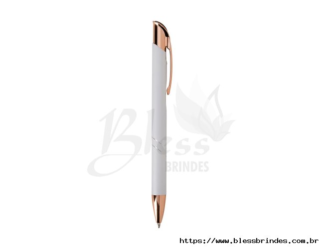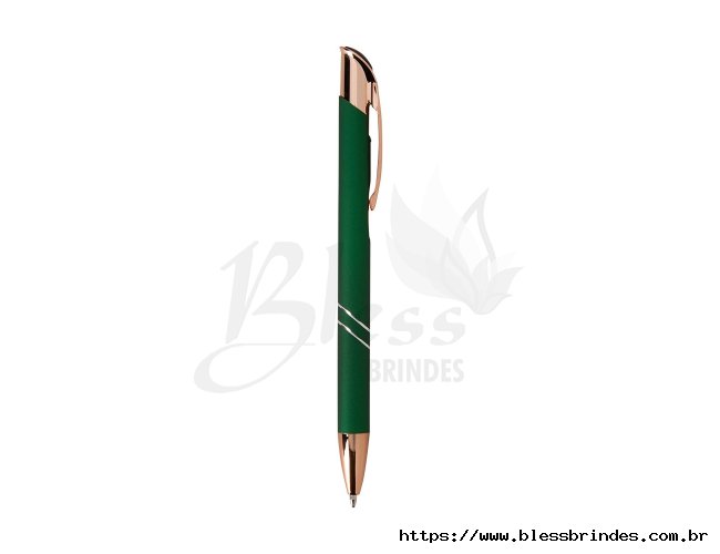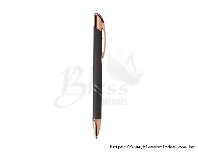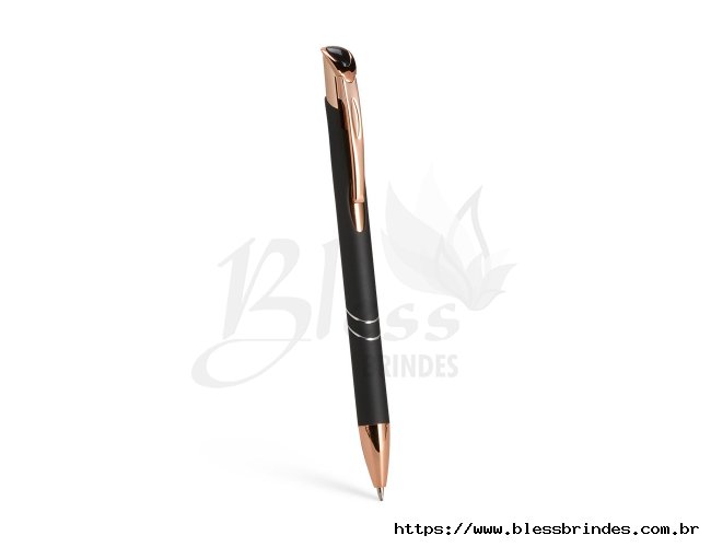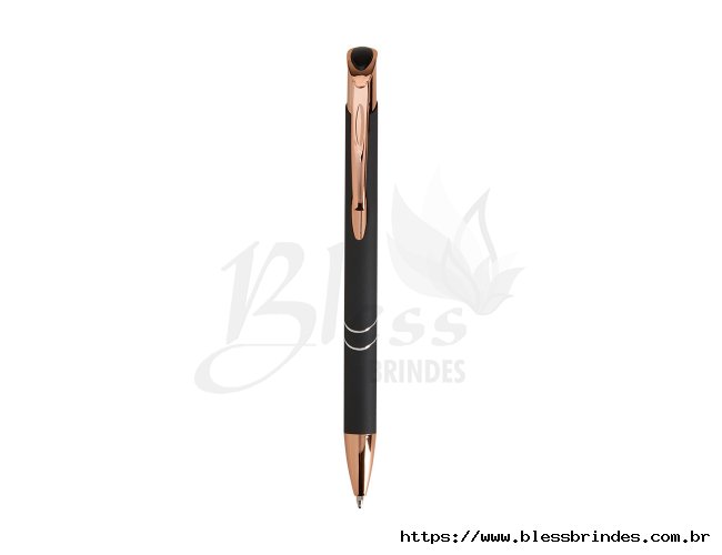 Caneta metálica com detalhes em plástico, acionamento por clique e carga esferográfica azul de 1.0mm, o que proporciona uma pegada leve e uma escrita precisa
