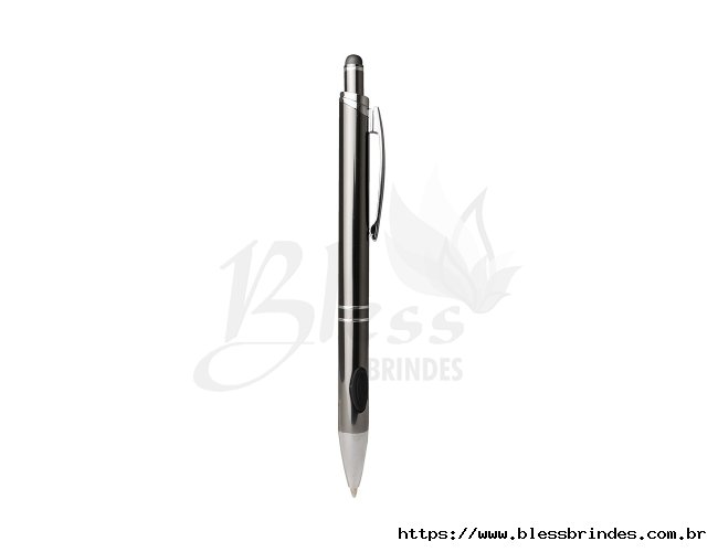 Caneta metálica com touchscreen, com detalhe emborrachado na parte inferior, carga esferográfica azul de 1.0 mm e acionamento por clique.