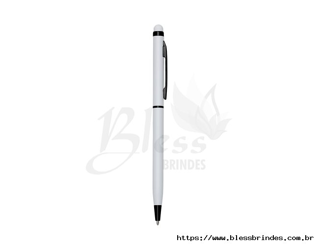 Caneta metálica com touch screen, carga esferográfica azul e acionamento por rotação.