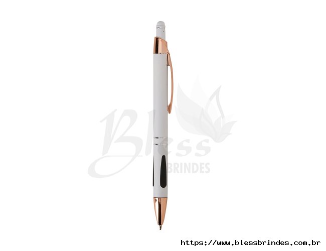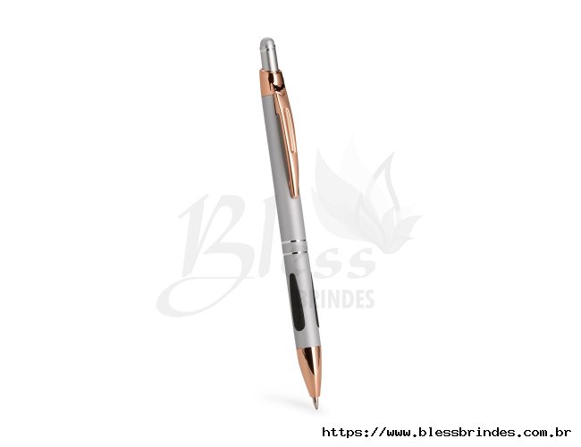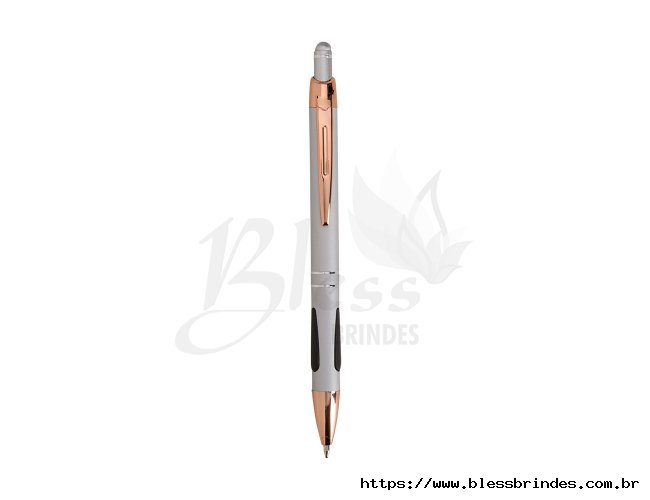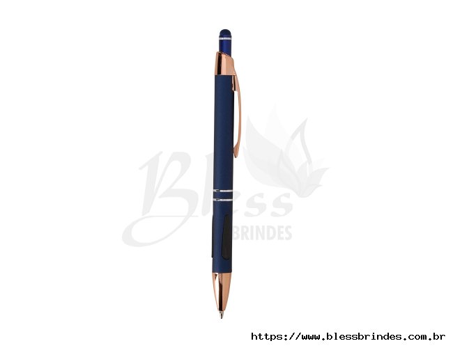 Caneta em metal com detalhes emborrachados, carga esferográfica azul de 1.0mm e acionamento por clique com acabamento emborrachado que permite seu uso como uma caneta touch para interação com dispositivos de tela sensível ao toque.