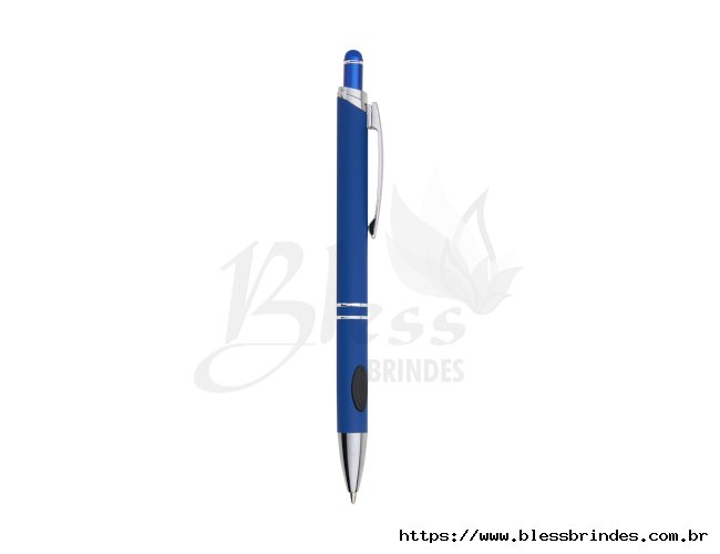 Caneta metálica touchscreen com acabamento emborrachado, acionamento por clique e carga esferográfica azul 1.0mm.
