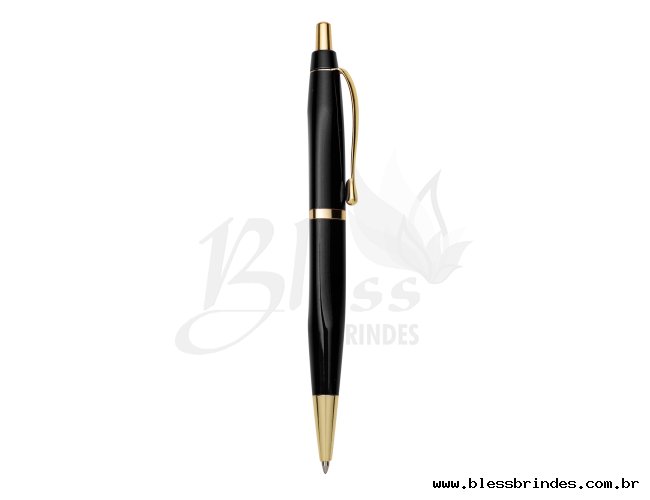 Caneta metal triangular com pintura colorida e detalhes dourados. Clip metálico, acionador, anel e ponteira dourada. Aciona por clique.