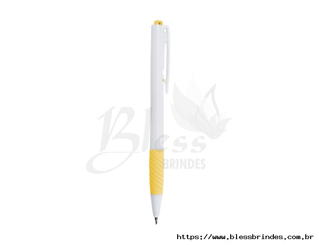 Caneta plástica com detalhe emborrachado e acionamento por clique, carga esferográfica azul 0.8mm.
