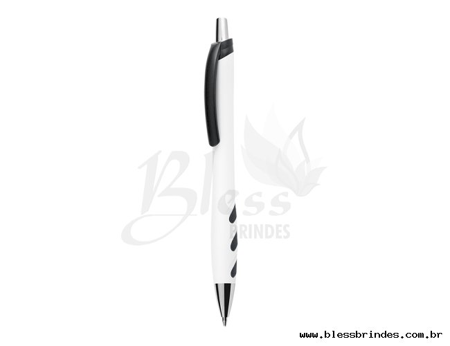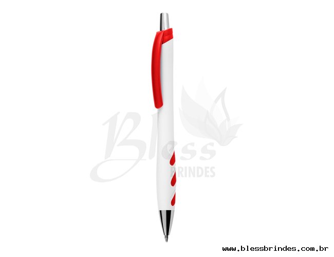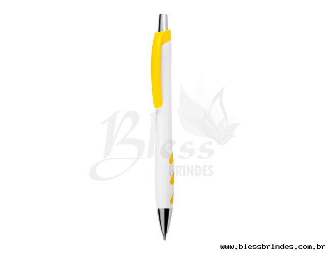 Descrição: Caneta plástica branca com detalhes coloridos. Clip plástico colorido e acionador prata, possui detalhe emborrachado colorido na parte inferior. Aciona por clique.