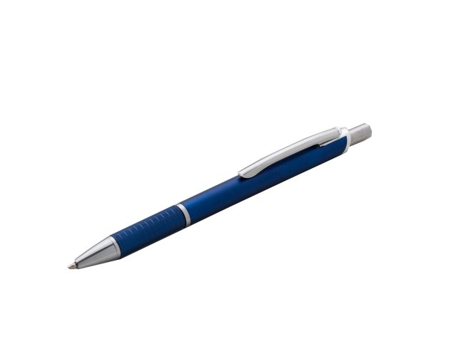 Caneta plástica fosca inteira colorida com detalhes prata. Clip de metal, anel prata e parte inferior da caneta possui detalhes com relevo, aciona por clique.