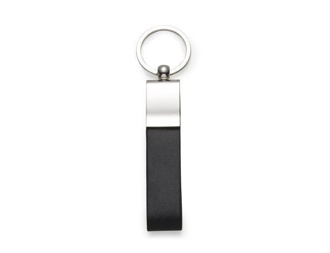 Chaveiro metal brilhante frente lisa e verso com dois parafusos, possui alça de couro preto e suporte do chaveiro é giratório.