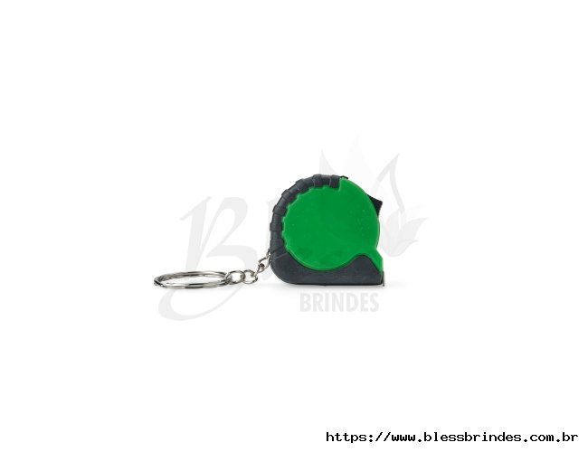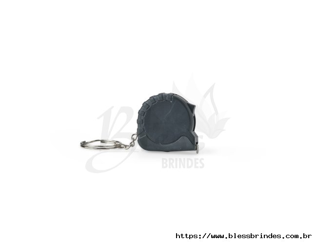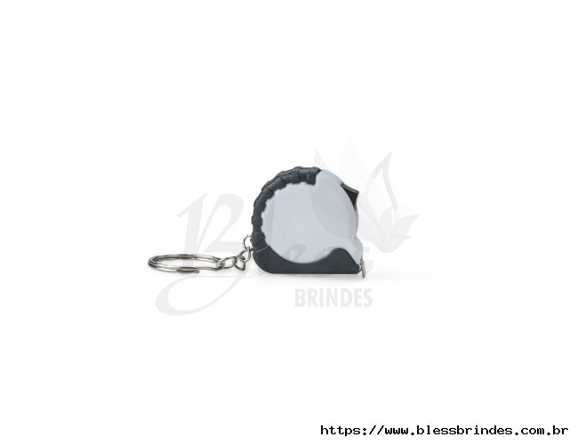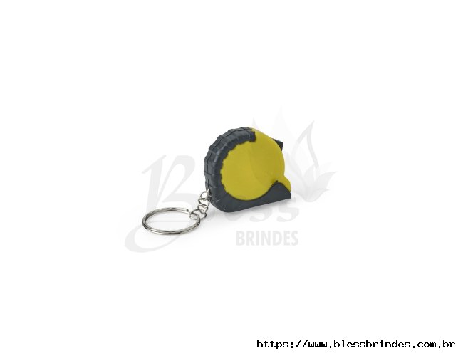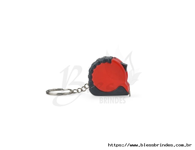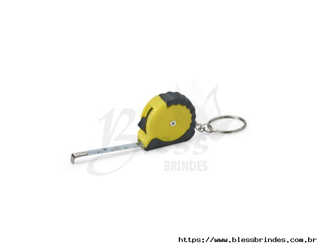 Chaveiro trena feito em plástico com argola metálica e fita de aço com alcance de até 1 metro, também com marcação de medidas em pés e polegadas.