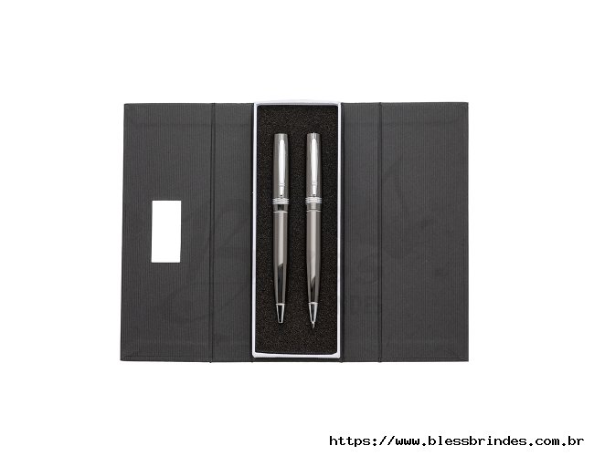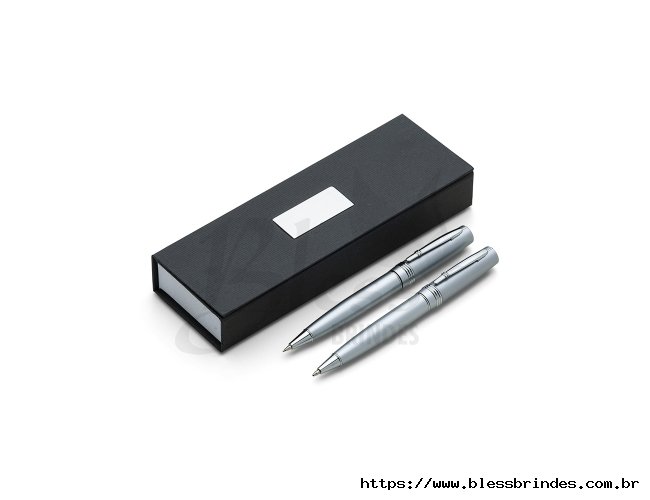 Conjunto caneta e lapiseira em estojo de cartonagem com placa central para personalização. Caneta/Lapiseira metal inteira colorida com detalhes prata, clip metal com duas “linhas” e na “ponta” superior detalhe de uma linha no meio. Possui três anéis abaixo do clip, anel centralizado e anel inferior e acionam por giro. Estojo revestida com espuma na parte interna.