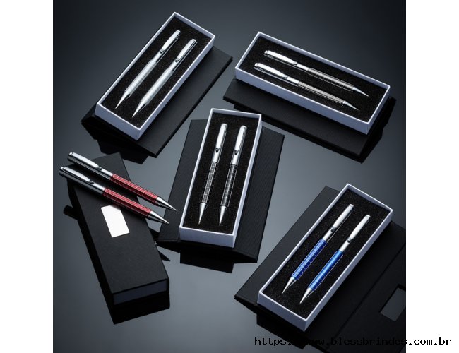 Kit caneta e lapiseira de metal em estojo papelão com placa de metal(parte interna do estojo revestida com espuma). Caneta e lapiseira prata com detalhes coloridos e quadriculados, clip metal com anel superior na ponta e dois anéis centrais e acionam por giro.