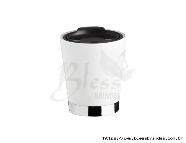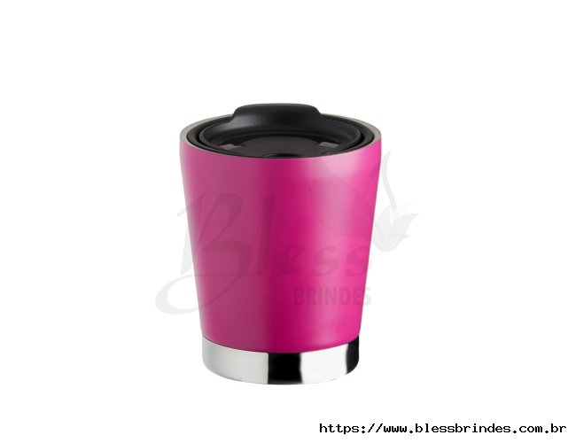 Copo de parede dupla em inox 304 com capacidade de 300ml, possui tampa plástica de encaixe com acesso ao bocal e área para canudo (não acompanha).