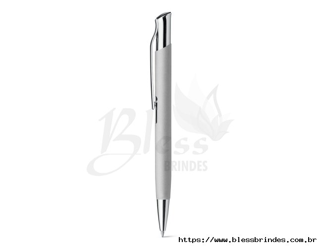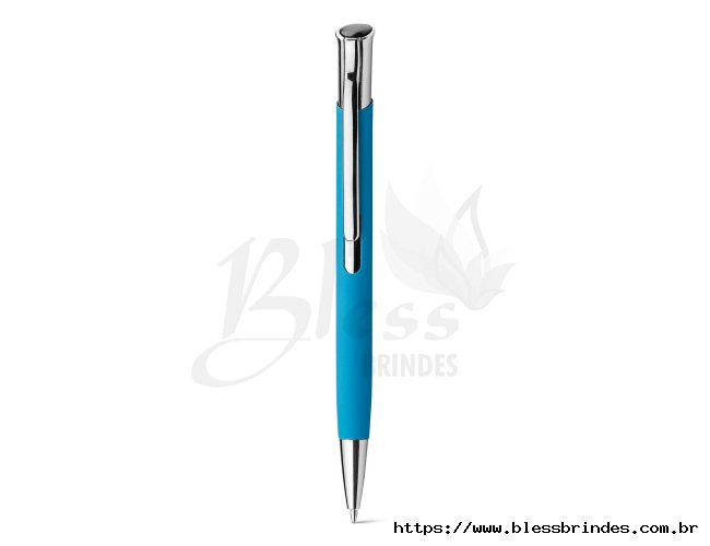 Esferográfica em alumínio com acabamento emborrachado e clipe de metal. Escrita em azul. ø10 x 137 mm