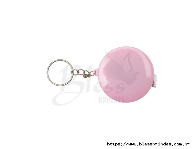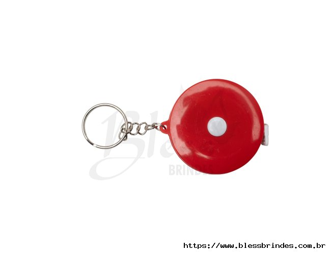 Fita métrica de 1,50 metro em plástico redondo, frente lisa e verso com botão (trava). Acompanha chaveiro.
