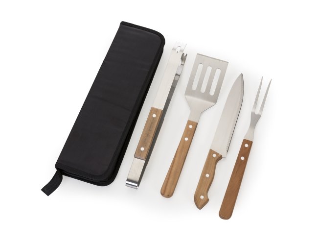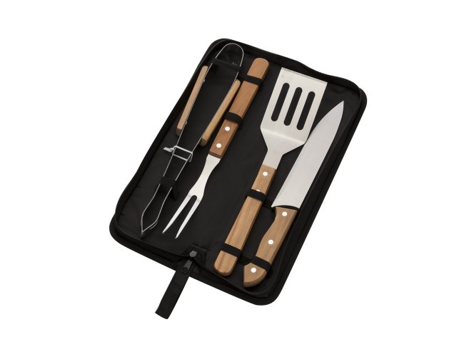 Kit churrasco 4 peças em estojo de nylon com alça. Possui: pegador, garfo, faca e espátula de madeira, acompanha proteções plásticas(faca e garfo) e parte interna com elástico para guardar as peças.