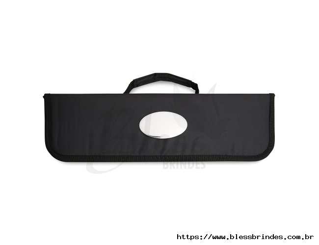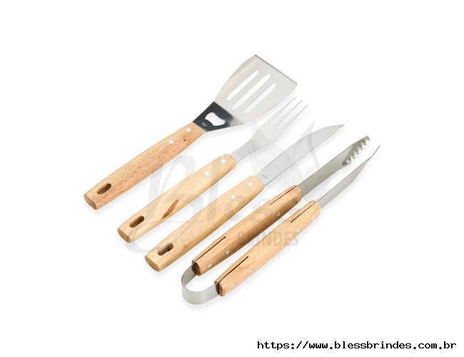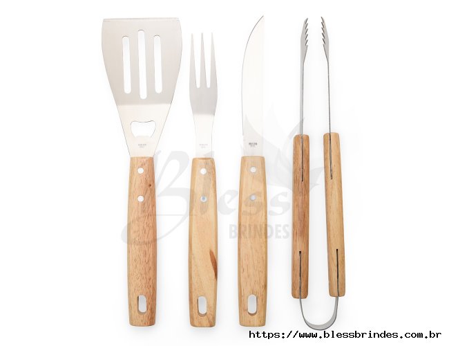 Praticidade para qualquer churrasco! Este kit conta com quatro peças essenciais: espátula, garfo, pegador e faca de 6 polegadas, todas em aço inox com cabos de madeira, acomodadas em um estojo de nylon que facilita o armazenamento e transporte. Para maior exclusividade, acompanha uma plaquinha metálica personalizável com verso autoadesivo.