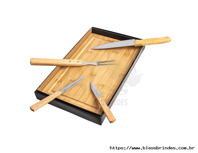 Kit para preparar os churrascos mais deliciosos, composto por cinco peças com lâminas em aço inox e cabos de madeira. Inclui três facas de 3", 4" e 6" polegadas, um garfo e uma tábua de bambu, todos acomodados em uma caixa de papelão. É a escolha perfeita para quem aprecia uma boa carne em momentos de conivência.