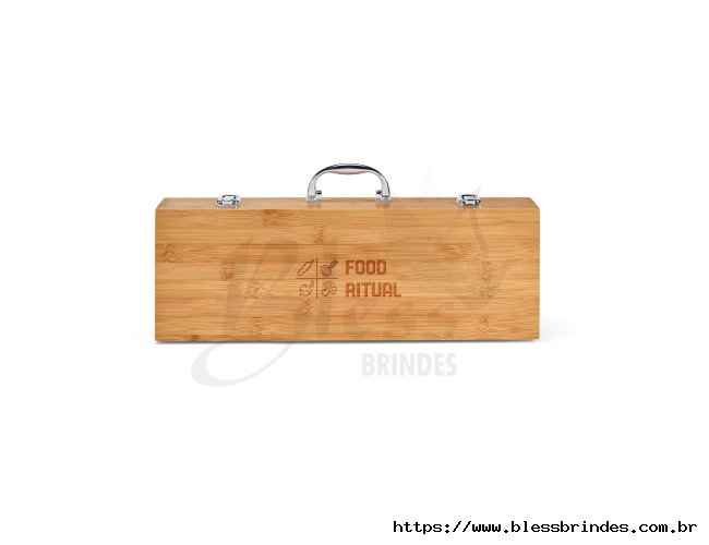 Kit churrasco em estojo de bambu. Composto por 6 peças em aço inox e bambu: faca chefe, faca média, faca japonesa, pinça, garfo e afiador. Food grade. Estojo: 455 x 160 x 65 mm
