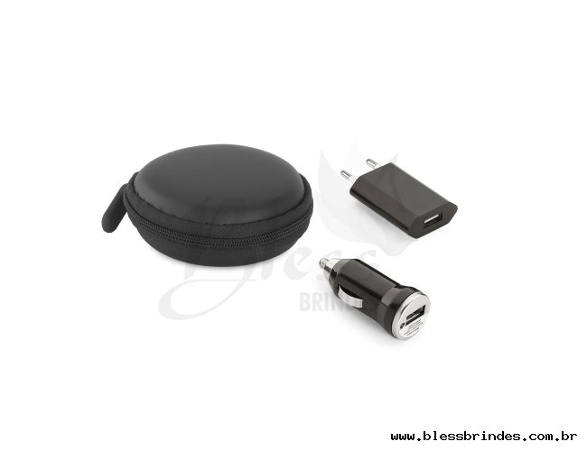 Kit de adaptadores USB em ABS. Incluso adaptador de corrente DC 110V/220V e adaptador para carro DV 12-24V. Fornecido com bolsa EVA. Bolsa: ø75 x 36 mm