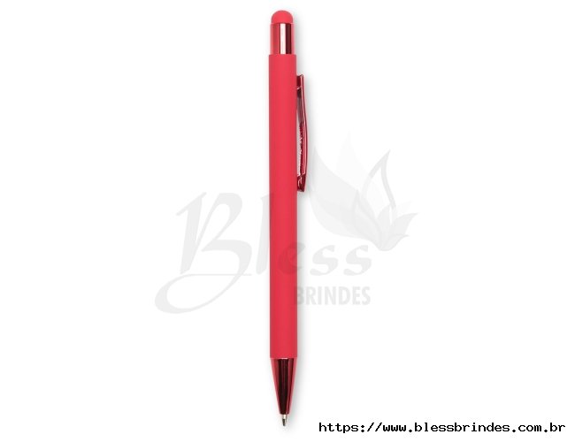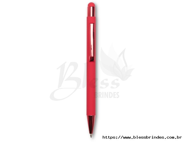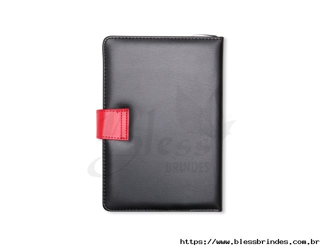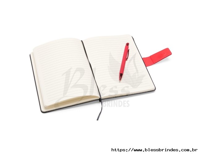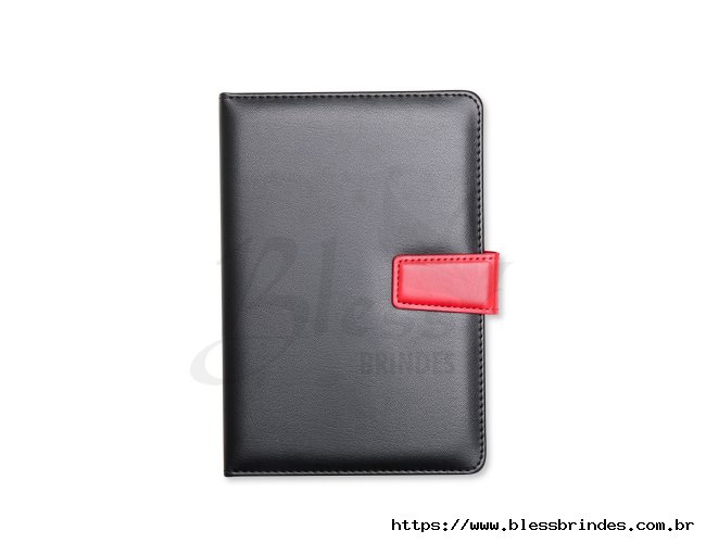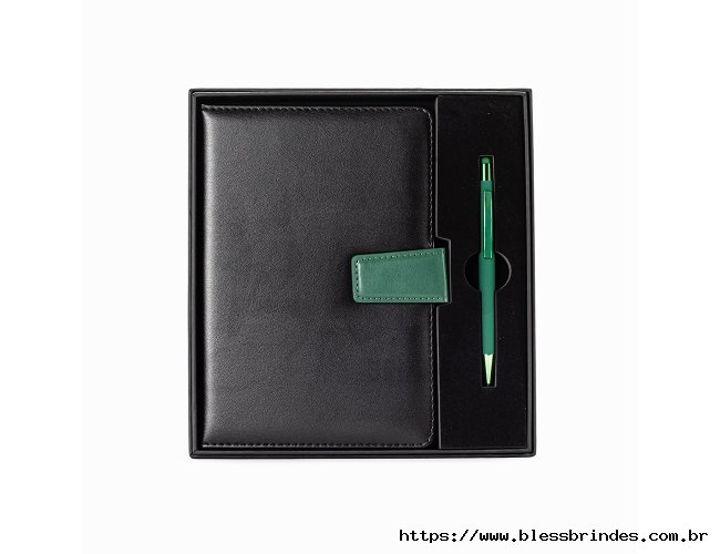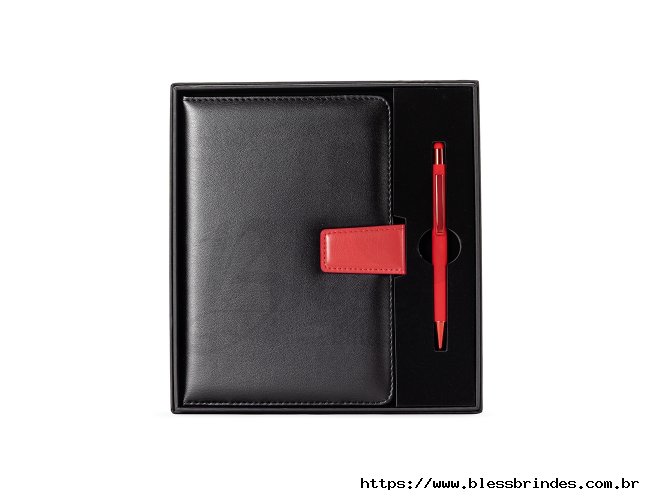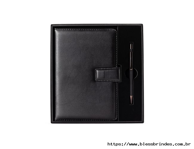 Kit executivo com duas peças, composto por uma caderneta de capa em couro sintético com fechamento magnético e cerca de 80 folhas pautadas, e uma caneta em metal com detalhes em plástico, ponteira emborrachada para uso em dispositivos touchscreen e carga esferográfica azul de 1,0 mm. Acompanha uma caixa de papelão com berço em espuma para a caneta.