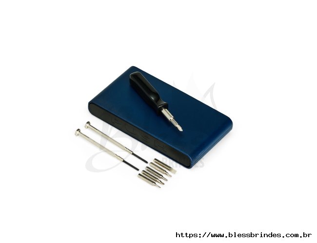 Kit ferramenta com 9 peças em estojo plástico com botão de acionamento. Contém: 1 chave extensora rotatória para conexão das ponteiras, 3 ponteiras Phillips, 3 ponteiras fenda, 1 chave Phillips, 1 chave de fenda.