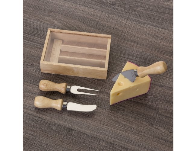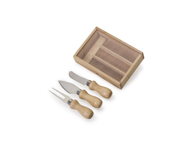 Kit queijo 3 peças em estojo de madeira com tampa plástica. Possui faca com ponta, garfo e faca reta.
