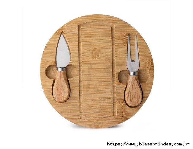 Kit queijo 3 peças, contém: tábua de bambu com canaleta, faca com ponta, garfo e espátula. Tábua com imã para encaixe e fixação dos utensílios.