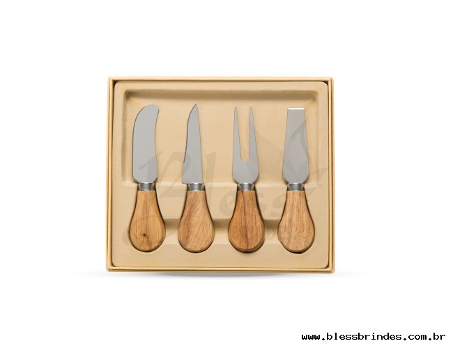Kit queijo com quatro peças em estojo de papelão. Contém os talheres: faca, faca com ponta, garfo e faca reta. Parte interna com suporte plástico aveludado com encaixe para os talheres.
