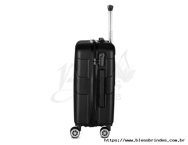 Mala de viagem 47 litros com segredo, possui 3 divisões internas, rodinhas 360 graus, quatro apoiadores, alça superior do carrinho com botão para ajuste de tamanho e mais duas alças para as mãos. Acompanha placa central para personalização.