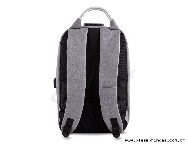 Descrição: Mochila anti-furto com cadeado de segredo. Material de poliéster cinza, tem a parte frontal à prova d’água (respingos). Compartimento principal com bolso para notebook e bolso de tela, parte externa com cadeado de segredo para trava dos zíperes; bolso médio com pequenas divisórias e bolso frontal com fita reflexiva. Possui entrada para fone de ouvido, suporte com entrada USB na parte externa e cabo USB acoplado internamente; permitindo a conexão de um carregador portátil na área interna e a conexão de um eletrônico na área externa, viabilizando a carga e utilização do eletrônico enquanto caminha. Alças para costa ajustáveis, alça para mãos em metal, alça horizontal para encaixe em malas de viagem, alças de costa e parte traseira revestidas com espuma para um maior conforto. Utilização do cadeado: para criar um segredo pressione e segure o botão, crie a numeração desejada e em seguida solte o botão para assumir a codificação criada, repita o mesmo processo sempre que necessitar fazer alguma alteração.