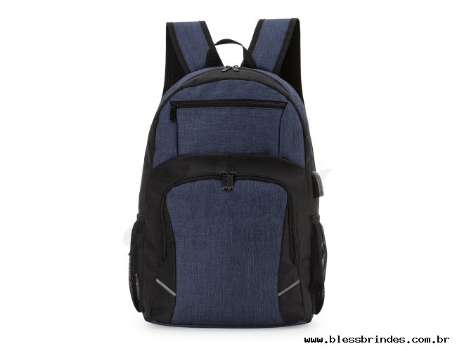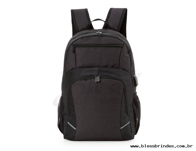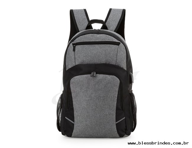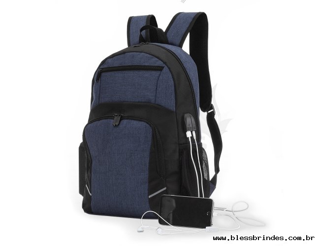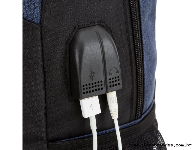 Descrição: Mochila confeccionada em poliéster, contém compartimento principal com divisória para notebook até 15,6 polegadas, dois compartimentos frontais, bolsos laterais em tela e adaptadores externos P2 e USB com cabos acoplados na área interna, permitindo a conexão de dispositivos por dentro da mochila. A mochila possui alça de mão, alças para as costas reguláveis com revestimento espumado e pequenas faixas reflexivas na área frontal.