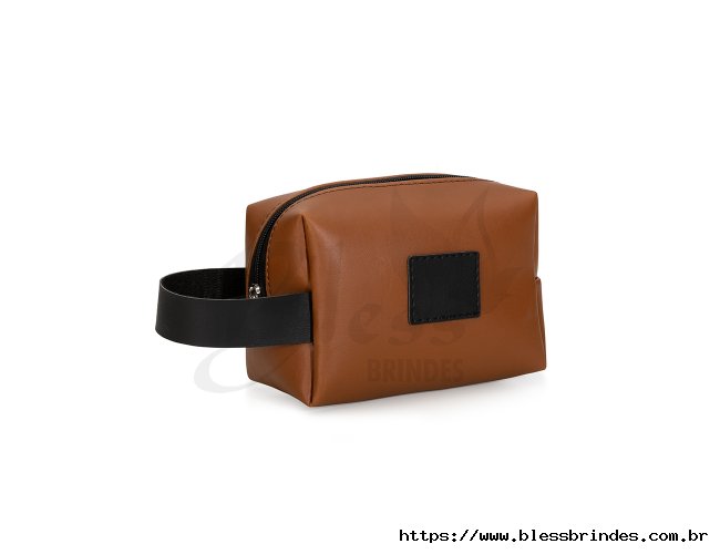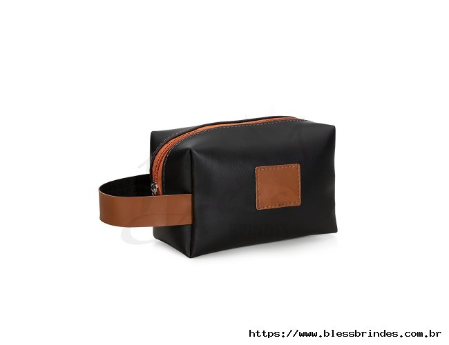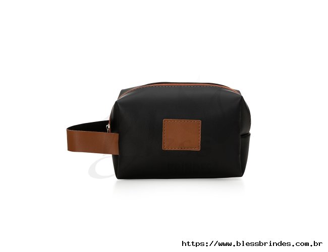 Nécessaire de couro sintético bidins com alça para transporte, possui plaquinha frontal para personalização e área interna da necessaire revestida de nylon.
