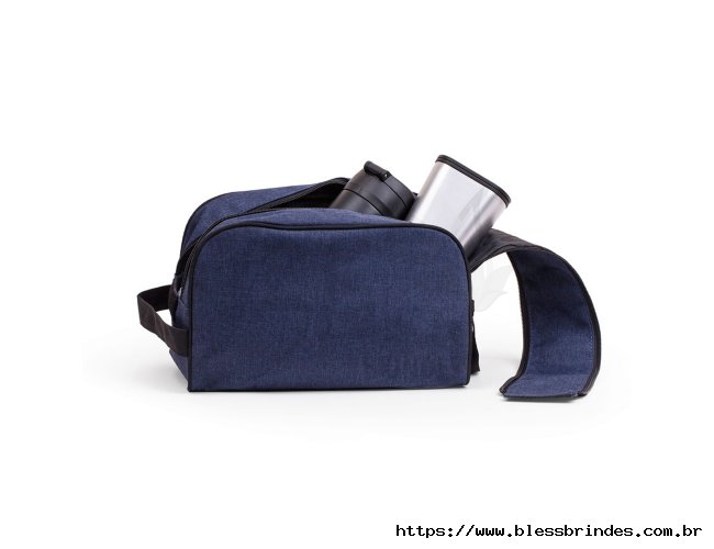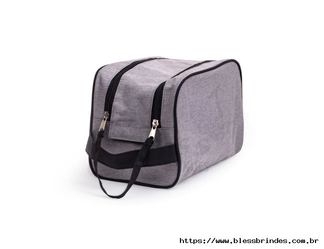 Necessaire confeccionada em poliéster com zíper duplo e trava de velcro. Zíper com “pegador” de cordão em nylon e alça para transporte.