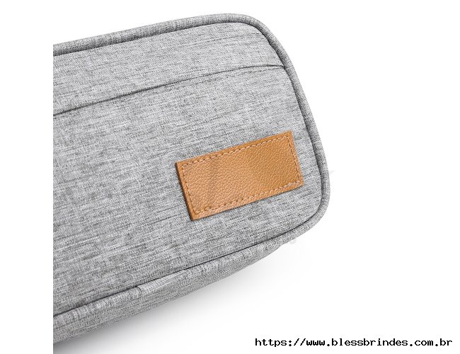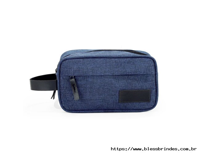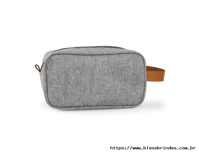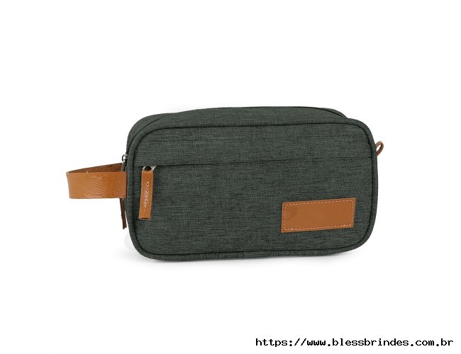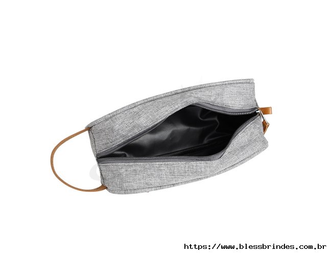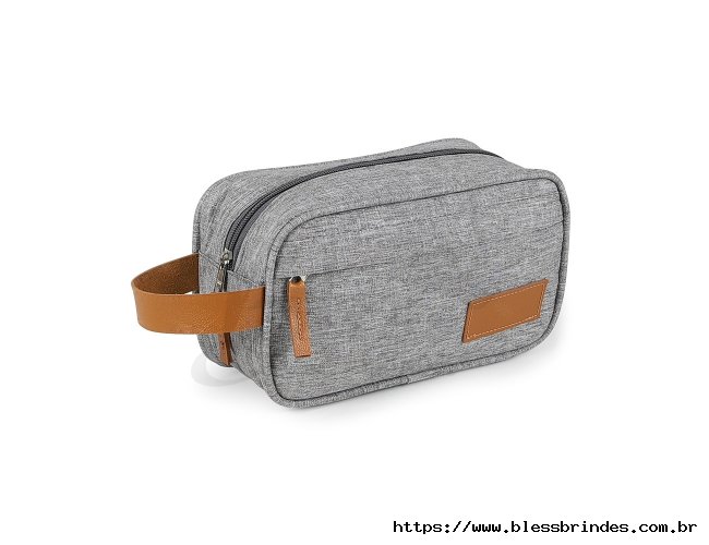 Nécessaire confeccionada em poliéster com detalhes em couro sintético, possui dois compartimentos com zíper, alça para transporte e alça pequena para acesso de chaveiro ou gancho.