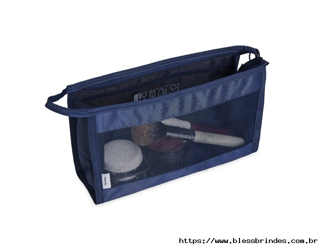 Nécessaire organizadora em poliéster, possui compartimento principal com bolso de zíper resistente à água.