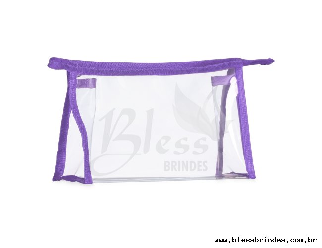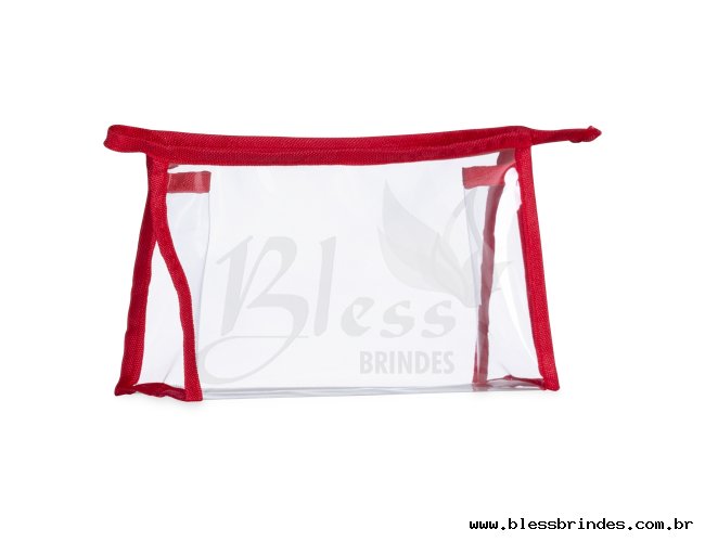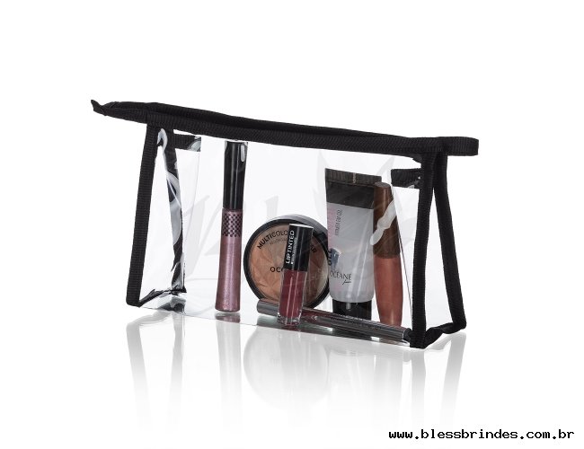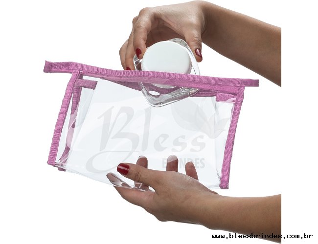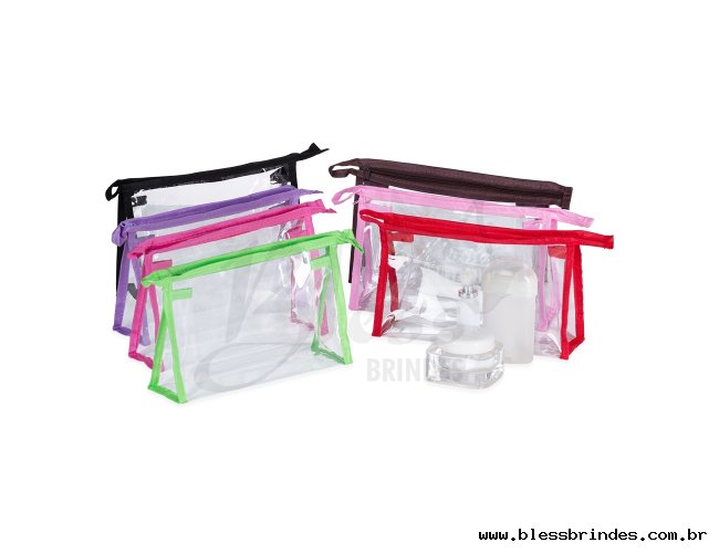 Descrição: Necessaire plástica transparente com detalhe colorido em nylon.