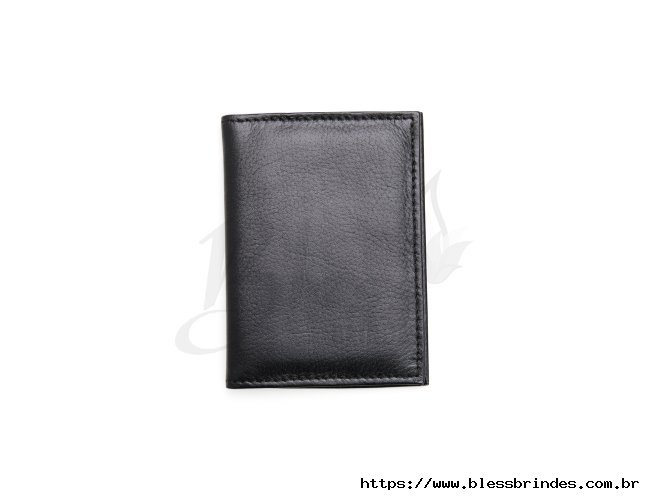 Porta-cartão em couro com três divisórias para cartões e documentos, além de um bolso adicional com visor em plástico transparente.